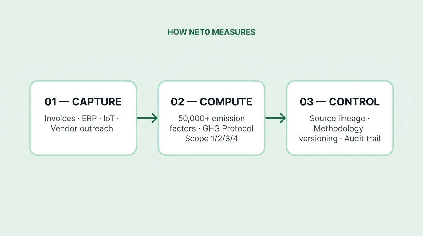 Net0 Measure was built to dissolve that constraint. It converts carbon accounting from an annual reconstruction exercise into a continuous, AI-driven data infrastructure layer — one that captures emissions at the moment they are generated, computes them against the latest methodologies, and keeps every number traceable to its source.