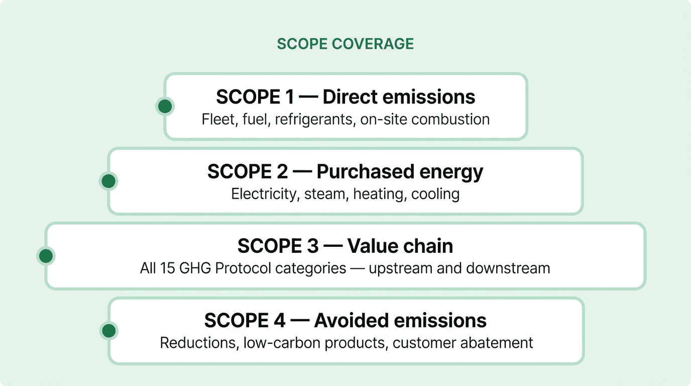 Scope 1, 2, 3 — plus Scope 4 avoided emissions